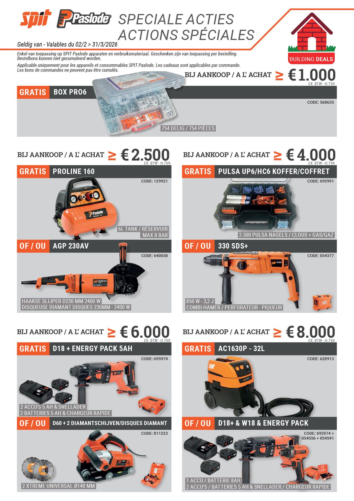 Il est intéressant de visiter cette page régulièrement car nous publions régulièrement de nouvelles promotions pour les outils et les machines. Il s’agit notamment de remises temporaires sur les ensembles, d'articles de fin de série à des prix irrésistibles et d'articles d'occasion.Pour les promotions sur les outils et les machines spécifiques à une marque, consultez nos catalogues actifs. Vous y trouverez également plusieurs offres temporaires et des remises, mais attention : les stocks sont limités, alors soyez rapide !